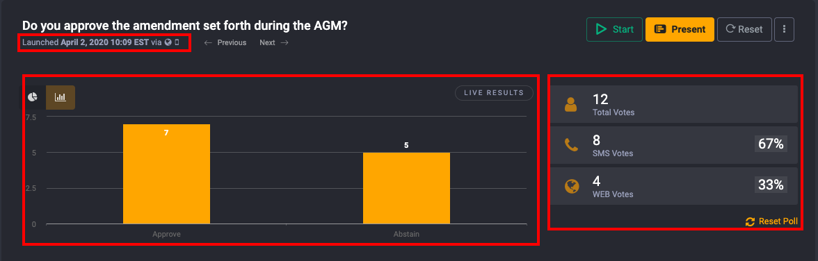 You can switch between the pie chart and column chart for the results. In the column chart, the results are shown in absolute numbers (find percentages in the pie chart)